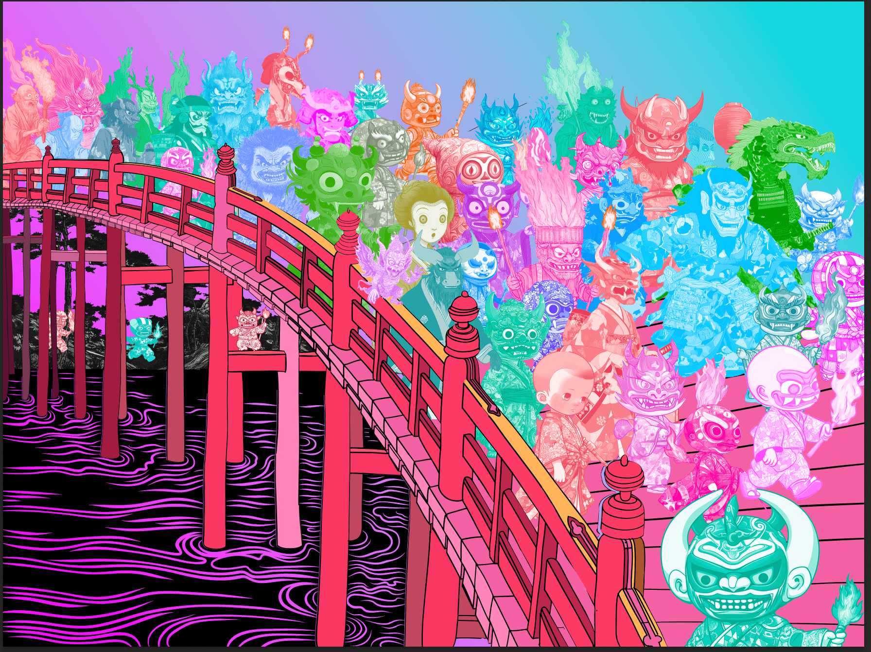 inspired by a famous Japanese folklore theme called Hyakki Yagyō—“The Night Parade of One Hundred Demons.” It depicts a midnight procession of yōkai (ghosts, spirits, shapeshifting creatures and haunted household objects); meeting the parade was considered dangerous unless protected by prayers or charms